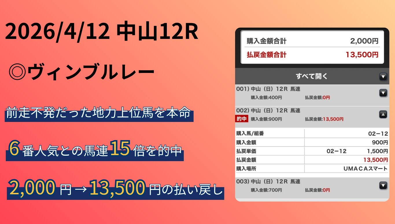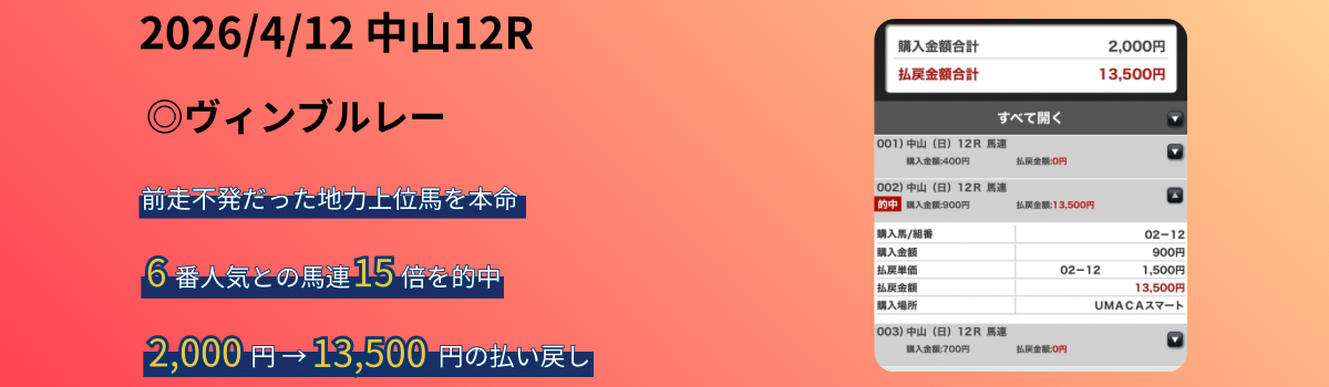福島芝1200mの傾向|馬番・位置取り・ペースなどから徹底分析 公開日:2026/04/01(水) Tableau分析コース傾向 福島芝1200mは、枠順・前走ローテ・脚質の影響が結果に出やすいコースです。この記事ではデータをもとに、好走しやすいパターンと馬券ポイントを整理していきます。 本記事では、以下の4視点でコース傾向を解説していきます。 本 […] 続きを読む