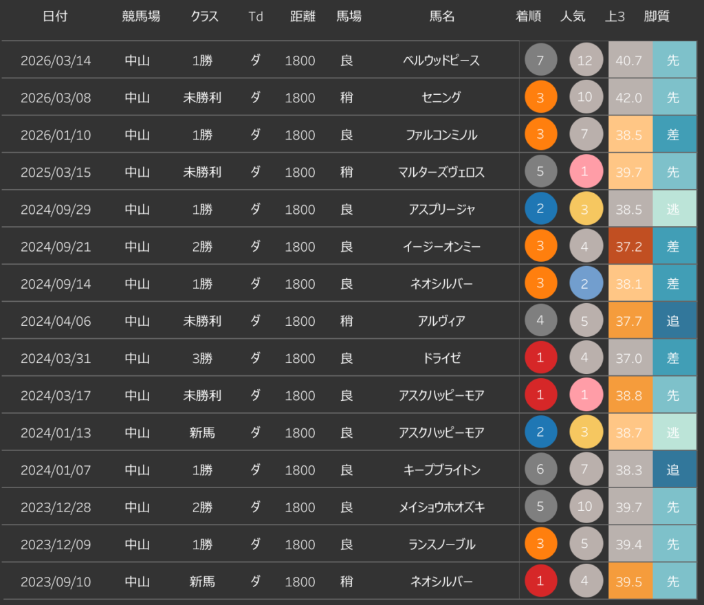 2026/3時点で、10番人気3着、7番人気3着と穴馬で激走しています。今後も「中山ダ1800×大外」の田辺騎手は要注目ですね。