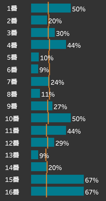 中山ダートは内~真ん中が有利になりやすいコース傾向ですが、田辺騎手はそれとは真逆で15・16番の大外で複勝率67%と騎手平均を大きく上回る数値を記録しています。