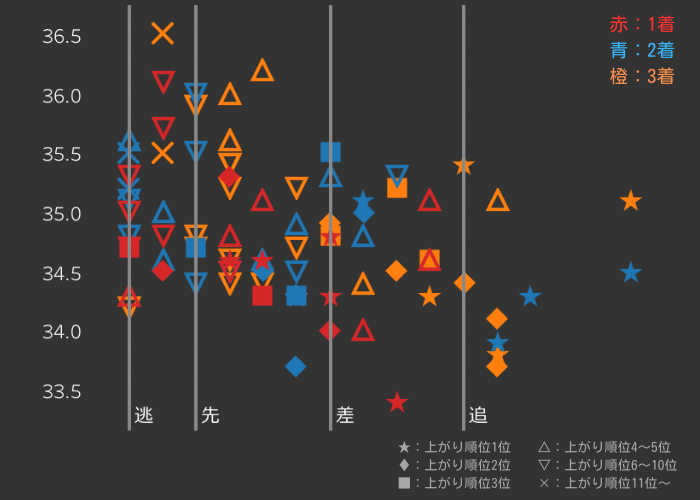 - 差し・追込みで好走する馬は、33秒台〜34秒台前半の鋭い上がりを使っているケースが目立ち、後方勢を買うなら、明確な上がり性能の裏付けが必要