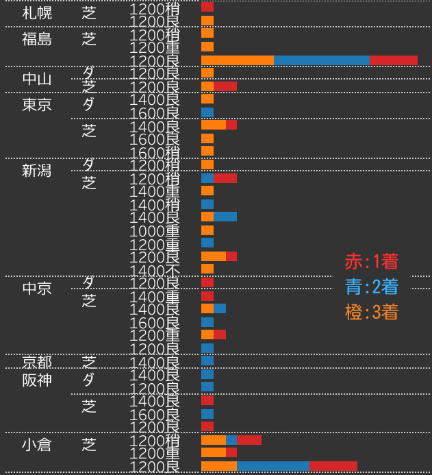 前走競馬場別の成績を見ると、福島芝1200mは「どこからでも来る」条件ではありません。前走も芝1200mを使ってきた馬が中心で、特に福島や小倉といったローカル芝1200m組の再現性が高いのが特徴です。