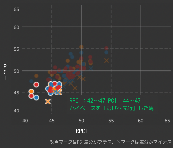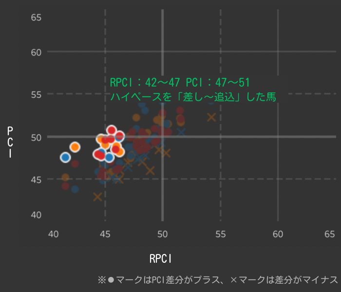 - RPCI「42〜47」のハイペースで、厳しい流れを先行してバテた馬を後方の馬が最後に強襲する