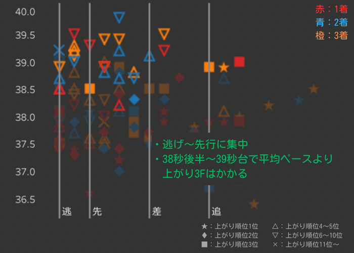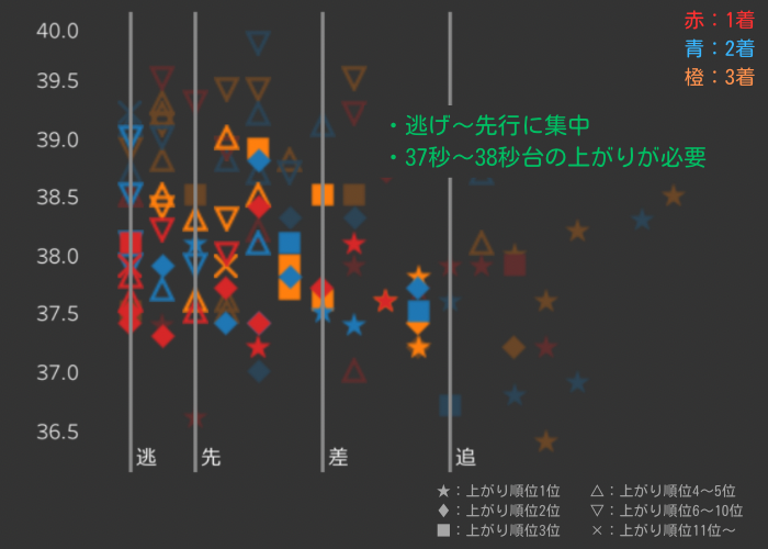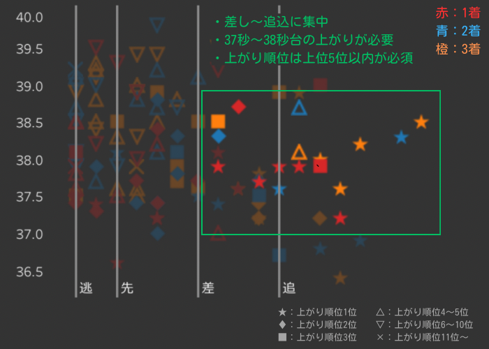 - 上がり順位は5位以内が必須で、上がりタイム「37〜38秒台」の上がりは必要