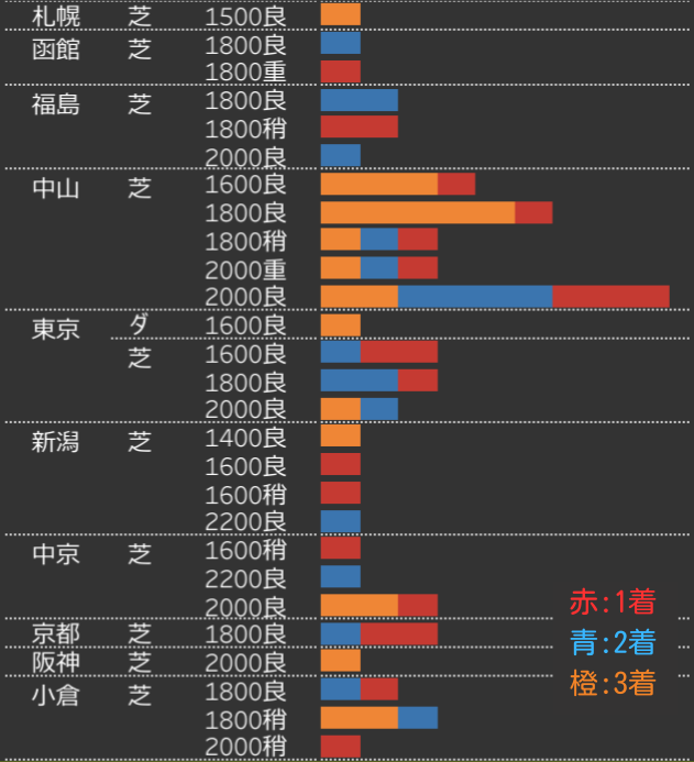 - 前走中山芝1800m・2000m組の好走が最も目立ち、同じ競馬場で近い距離を使ってきた馬の再現性が高い傾向