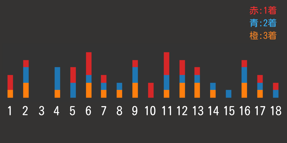 - 2番・5番は1〜3着がバランスよく積み上がり、相手候補として手堅い
