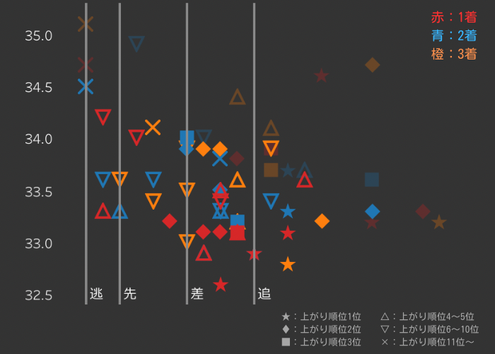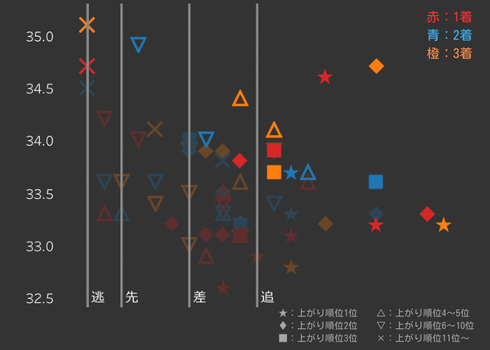 - 逃げ・先行ゾーンの馬も上がり33.5〜34.5秒付近で勝ち切れており、前で粘る馬にも勝機あり