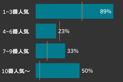 人気カテゴリー別の複勝率を見ると、上位人気での圧倒的な信頼性が浮かび上がります。