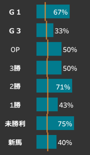 未勝利クラスで複勝率75%、2勝クラスで71%と下級条件での信頼度が非常に高い。さらにG1でも66.7%を記録しており、最高峰のレースでも実力が発揮されています。